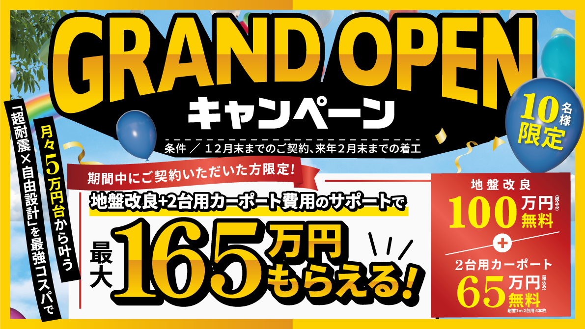 今なら 地盤改良+2台分カーポート費用のサポートで最大165万円分プレゼント!