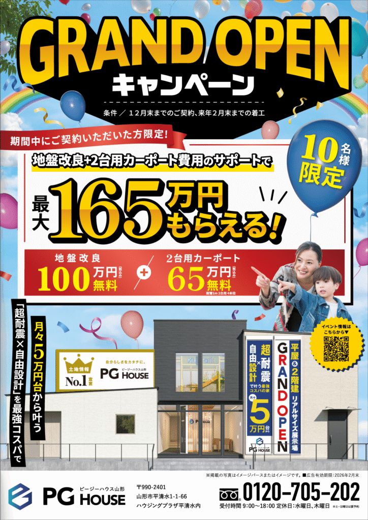 地盤改良100万円(税込)無料!+2台用カーポート65万円(税込)無料!(融雪1m 2台用4本柱)